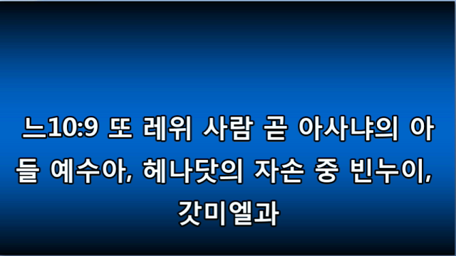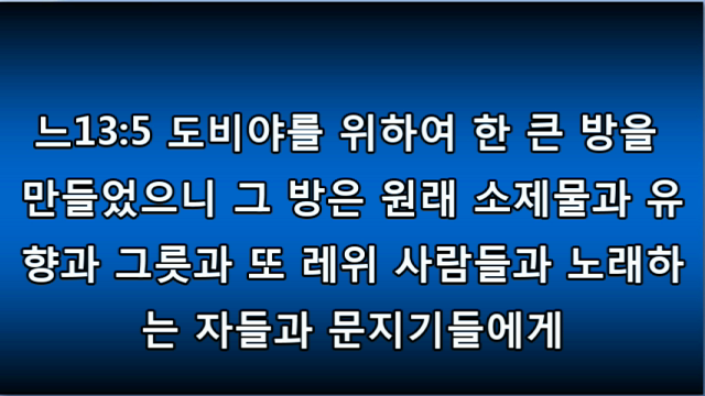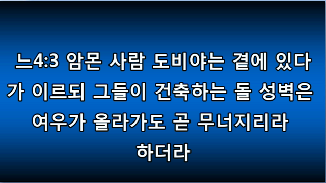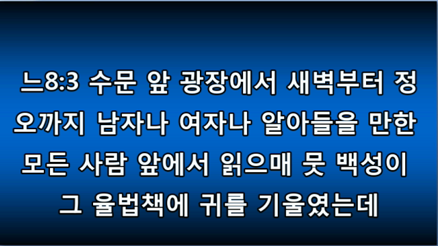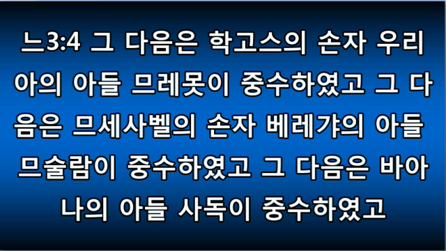 개역개정성경(큰글배경) 16-9 개역개정(큰글) 16느 03.mp3개역한글 ppt 한영ppt 영어성경 Nehemiah 03.mp3 느헤미야 3장.hwp http://tv.kakao.com/embed/player/cliplink/76385889?service=flash 1 Eliashib the high priest and his fellow priests went to work and rebuilt the Sheep Gate. They dedicated it and set its doors in place, building as far as the Tower of the Hundred, which they dedicated, and as far as the Tower of Hananel.1 그 ..