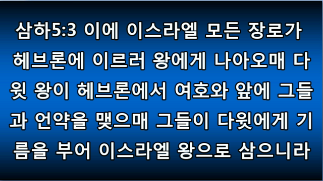 개역개정성경(큰글배경) 16-9 개역개정 (큰글) 10삼하 05.mp3개역한글 ppt 사무엘하05장.pptx한영ppt 사무엘하05장.pptx영어성경 2nd Samuel 05.mp3 사무엘하 5장.hwp http://tv.kakao.com/embed/player/cliplink/76096460?service=flash 1 All the tribes of Israel came to David at Hebron and said, "We are your own flesh and blood.1 이스라엘 모든 지파가 헤브론에 이르러 다윗에게 나아와 이르되 보소서 우리는 왕의 한 골육이니이다1. 以色列衆支派來到希伯崙見大衛,說:我們原是你的骨肉。 2 In the past, while Saul wa..